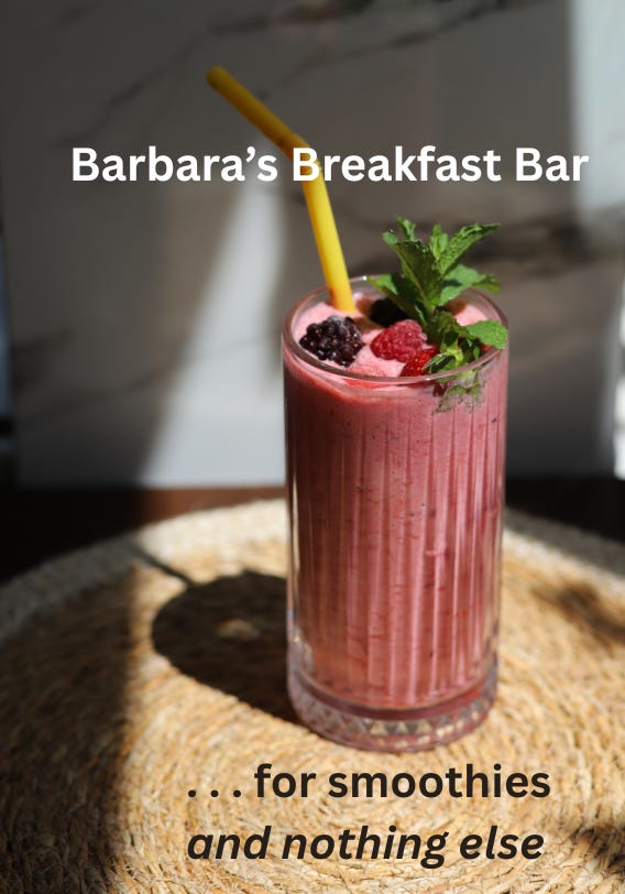 Her friends Jade and Cassie and Dominic show up the next day, more than a little high, and start playing with words that sit happily in their befuddled brains: Revelation Restaurant, Alessandra’s Aerie, Sassy Smoothies, Island Itinerant Eatery. For reasons no one can ever afterward remember, other than the pleasing alliteration, they settle on Barbara’s Breakfast Bar, even though there has never been anyone named Barbara even remotely connected with the building, the restaurant serves lunch as well as breakfast, and the place is neither a bar in the sense of serving alcoholic drinks nor does it have a traditional diner’s bar or counter for sitting at.